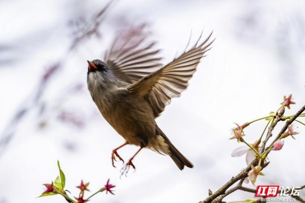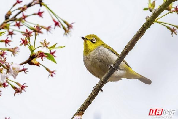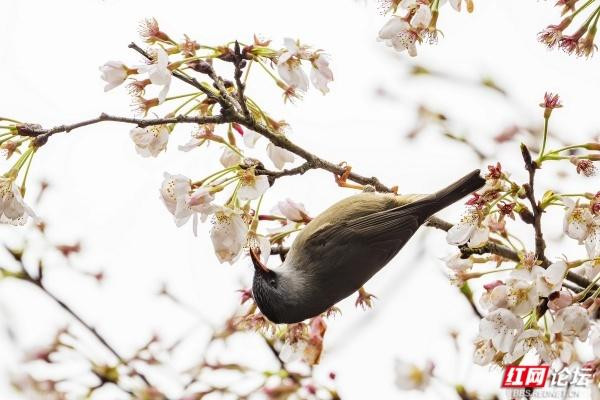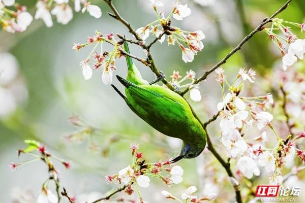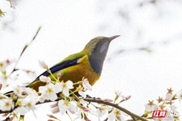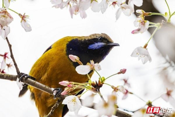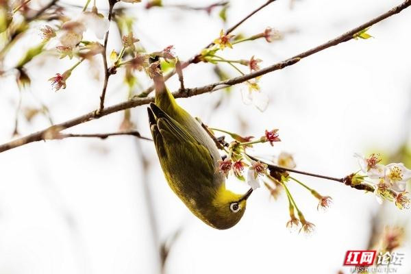 橙腹叶鹎是枝头最亮眼的色彩,雄鸟身披金橙羽衣,颈间一抹幽蓝如宝石镶嵌,静立花枝间,与粉白花瓣相映成趣;雌鸟通体翠绿,灵动地倒挂在枝桠上,尖喙轻探花蕊,仿佛在与春日私语。黑额凤鹛振翅而起,橙红的喙爪在舒展的羽翼间格外鲜明,似要奔赴一场花的邀约。绣眼鸟则是最灵动的常客,眼周一圈白羽如精心勾勒的眼线,黄腹灰背的身影穿梭花间,时而静立枝头凝望,时而振翅掠过花影,时而倒挂枝头啄食花蜜,每一个瞬间都满是生机。